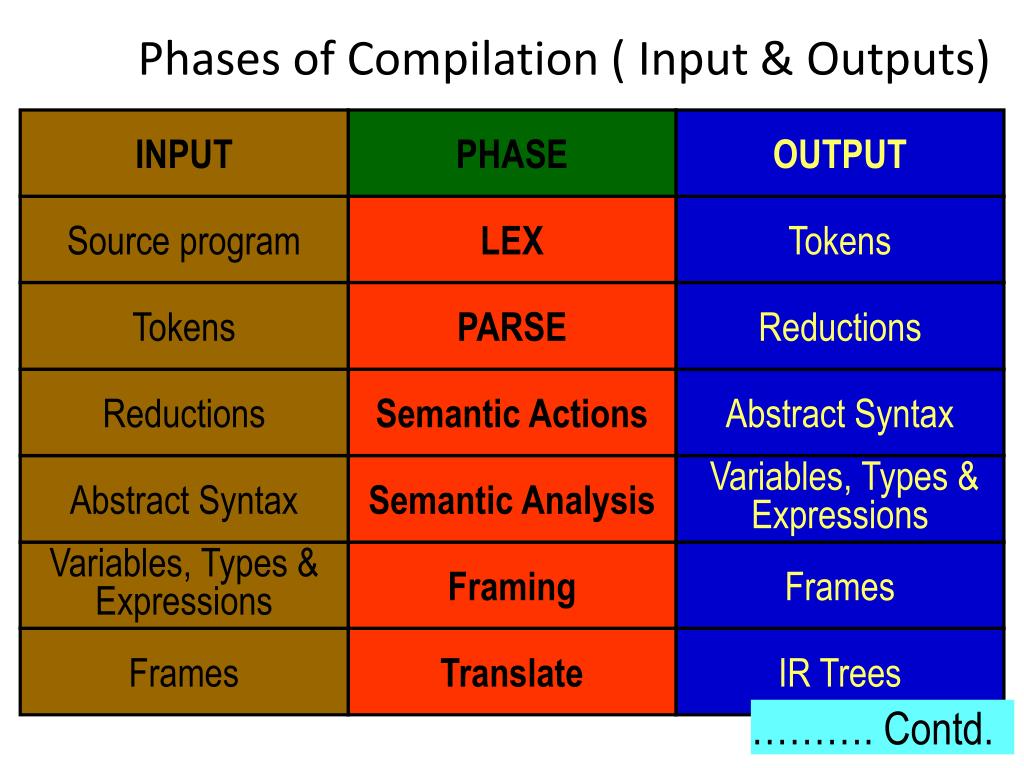 Phases of Compilation ( Input & Outputs) INPUT PHASE OUTPUT Source program LEX Tokens Tokens PARSE Reductions Reductions Semantic Actions Abstract Syntax Abstract Syntax Semantic Analysis Variables, Types & Expressions Variables, Types & Expressions Framing Frames Frames Translate IR Trees ………. Contd.