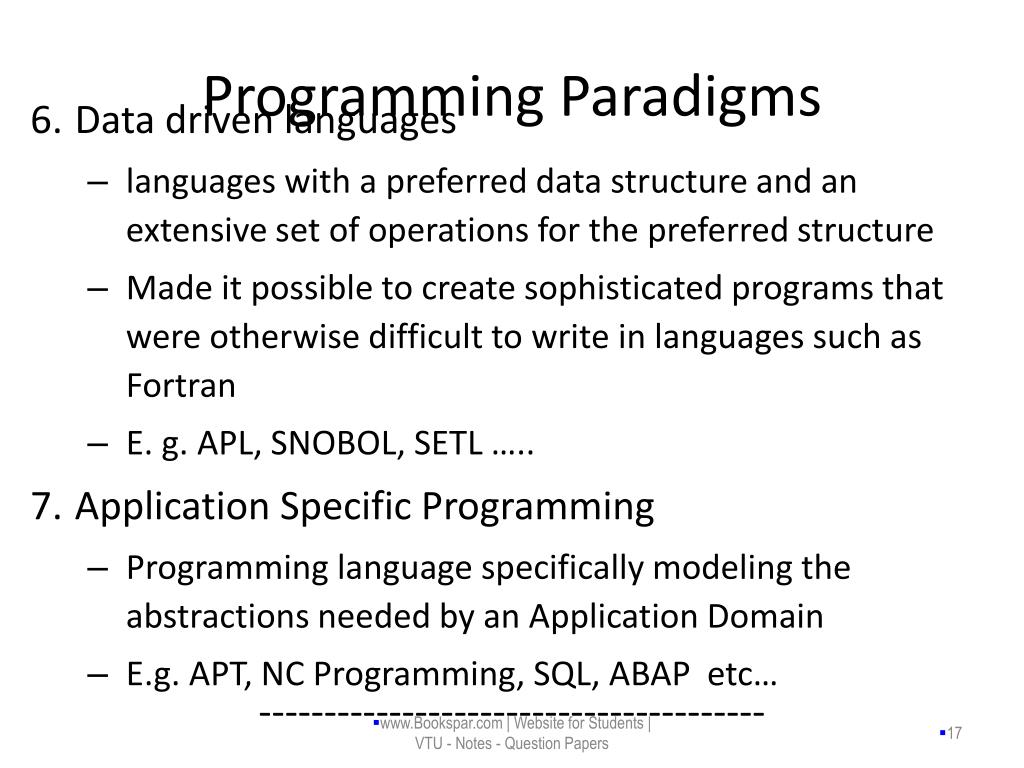 Programming Paradigms • Data driven languages • languages with a preferred data structure and an extensive set of operations for the preferred structure • Made it possible to create sophisticated programs that were otherwise difficult to write in languages such as Fortran • E. g. APL, SNOBOL, SETL ….. • Application Specific Programming • Programming language specifically modeling the abstractions needed by an Application Domain • E.g. APT, NC Programming, SQL, ABAP etc… --------------------------------------- www.Bookspar.com | Website for Students | VTU - Notes - Question Papers