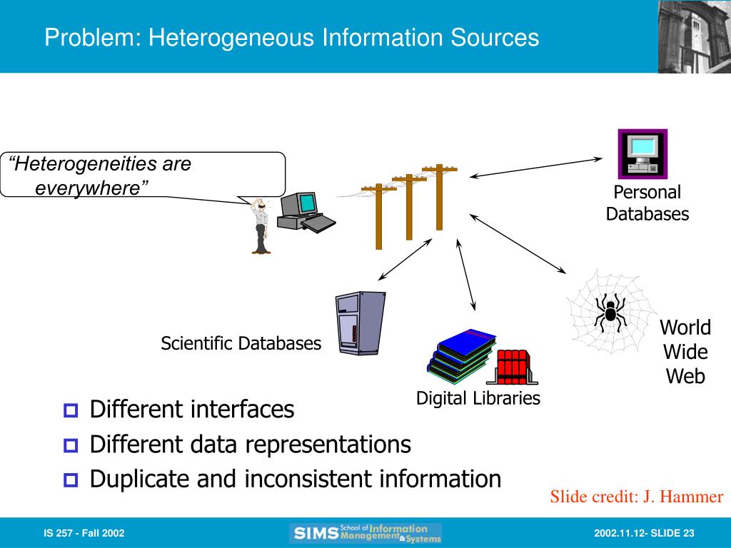 Problem: Heterogeneous Information Sources “Heterogeneities are everywhere” Personal Databases World Wide Web Scientific Databases Digital Libraries • Different interfaces • Different data representations • Duplicate and inconsistent information Slide credit: J. Hammer