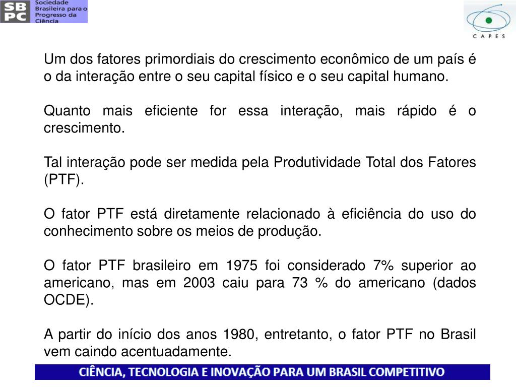 Um dos fatores primordiais do crescimento econômico de um país é o da interação entre o seu capital físico e o seu capital humano. Quanto mais eficiente for essa interação, mais rápido é o crescimento. Tal interação pode ser medida pela Produtividade Total dos Fatores (PTF). O fator PTF está diretamente relacionado à eficiência do uso do conhecimento sobre os meios de produção. O fator PTF brasileiro em 1975 foi considerado 7% superior ao americano, mas em 2003 caiu para 73 % do americano (dados OCDE). A partir do início dos anos 1980, entretanto, o fator PTF no Brasil vem caindo acentuadamente.