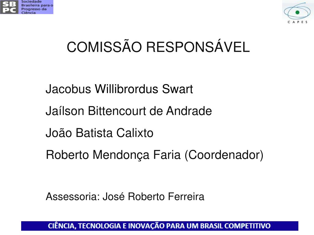 CIÊNCIA, TECNOLOGIA E INOVAÇÃO PARA UM BRASIL COMPETITIVO. Estudo encomendado pela CAPES e executado pela SBPC. COMISSÃO RESPONSÁVEL Jacobus Willibrordus Swart Jaílson Bittencourt de Andrade João Batista Calixto Roberto Mendonça Faria (Coordenador) Assessoria: José Roberto Ferreira.