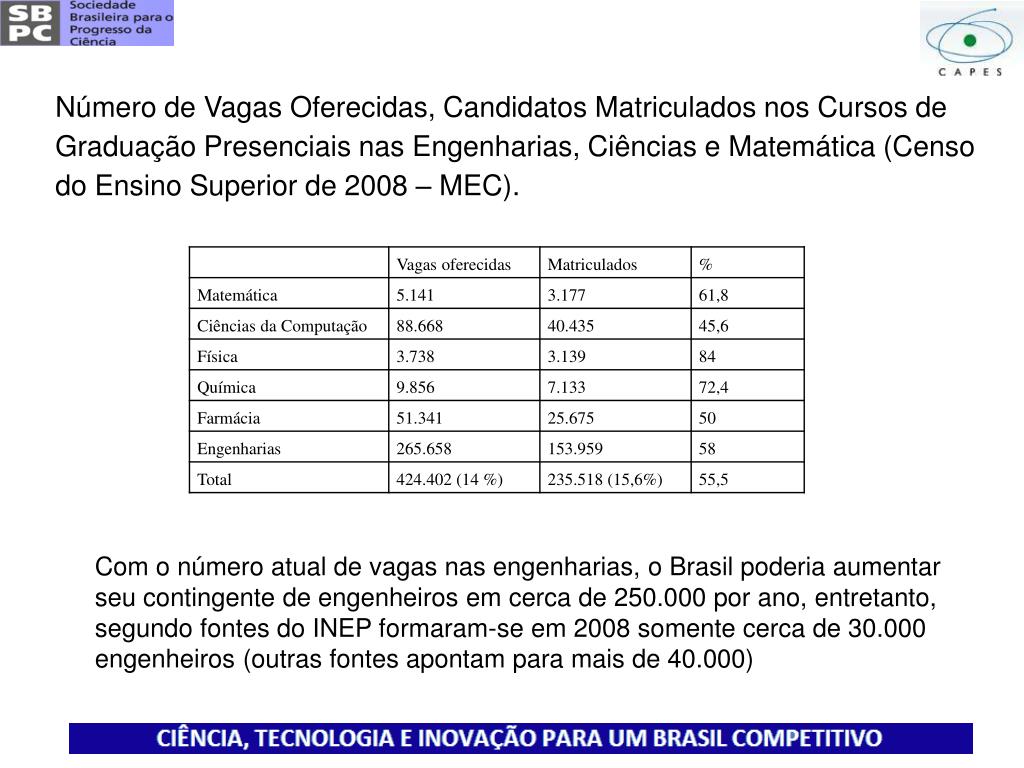 Com o número atual de vagas nas engenharias, o Brasil poderia aumentar seu contingente de engenheiros em cerca de 250.000 por ano, entretanto, segundo fontes do INEP formaram-se em 2008 somente cerca de 30.000 engenheiros (outras fontes apontam para mais de 40.000)