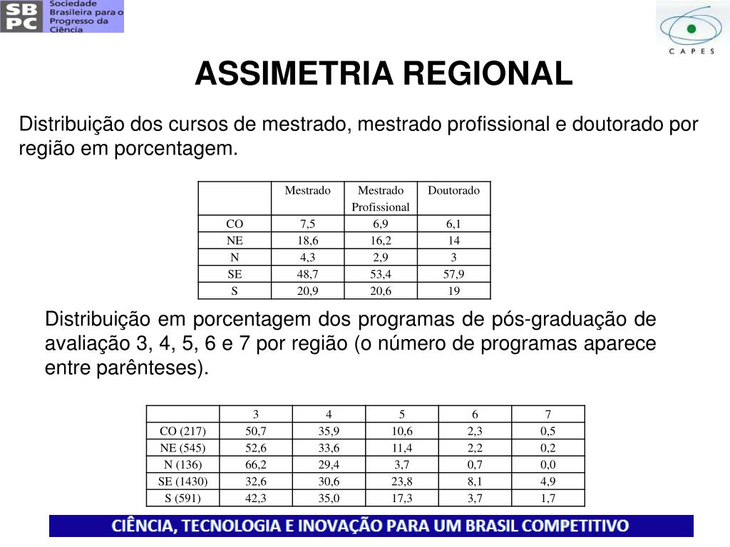ASSIMETRIA REGIONAL Distribuição dos cursos de mestrado, mestrado profissional e doutorado por região em porcentagem. Distribuição em porcentagem dos programas de pós-graduação de avaliação 3, 4, 5, 6 e 7 por região (o número de programas aparece entre parênteses).