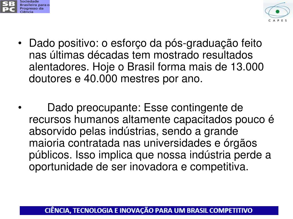 Dado positivo: o esforço da pós-graduação feito nas últimas décadas tem mostrado resultados alentadores. Hoje o Brasil forma mais de 13.000 doutores e 40.000 mestres por ano. • Dado preocupante: Esse contingente de recursos humanos altamente capacitados pouco é absorvido pelas indústrias, sendo a grande maioria contratada nas universidades e órgãos públicos. Isso implica que nossa indústria perde a oportunidade de ser inovadora e competitiva.