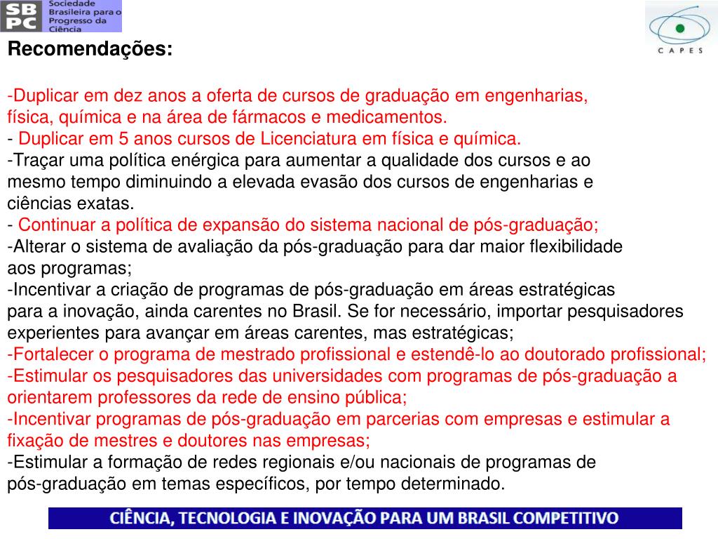 Recomendações: • Duplicar em dez anos a oferta de cursos de graduação em engenharias, • física, química e na área de fármacos e medicamentos. • - Duplicar em 5 anos cursos de Licenciatura em física e química. • Traçar uma política enérgica para aumentar a qualidade dos cursos e ao • mesmo tempo diminuindo a elevada evasão dos cursos de engenharias e • ciências exatas. • - Continuar a política de expansão do sistema nacional de pós-graduação; • Alterar o sistema de avaliação da pós-graduação para dar maior flexibilidade • aos programas; • Incentivar a criação de programas de pós-graduação em áreas estratégicas • para a inovação, ainda carentes no Brasil. Se for necessário, importar pesquisadores • experientes para avançar em áreas carentes, mas estratégicas; • Fortalecer o programa de mestrado profissional e estendê-lo ao doutorado profissional; • Estimular os pesquisadores das universidades com programas de pós-graduação a • orientarem professores da rede de ensino pública; • Incentivar programas de pós-graduação em parcerias com empresas e estimular a • fixação de mestres e doutores nas empresas; • Estimular a formação de redes regionais e/ou nacionais de programas de • pós-graduação em temas específicos, por tempo determinado.