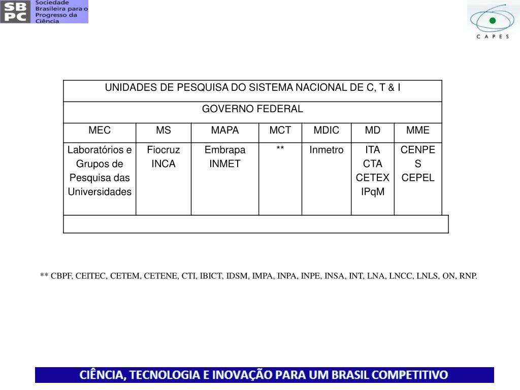 ** CBPF, CEITEC, CETEM, CETENE, CTI, IBICT, IDSM, IMPA, INPA, INPE, INSA, INT, LNA, LNCC, LNLS, ON, RNP.