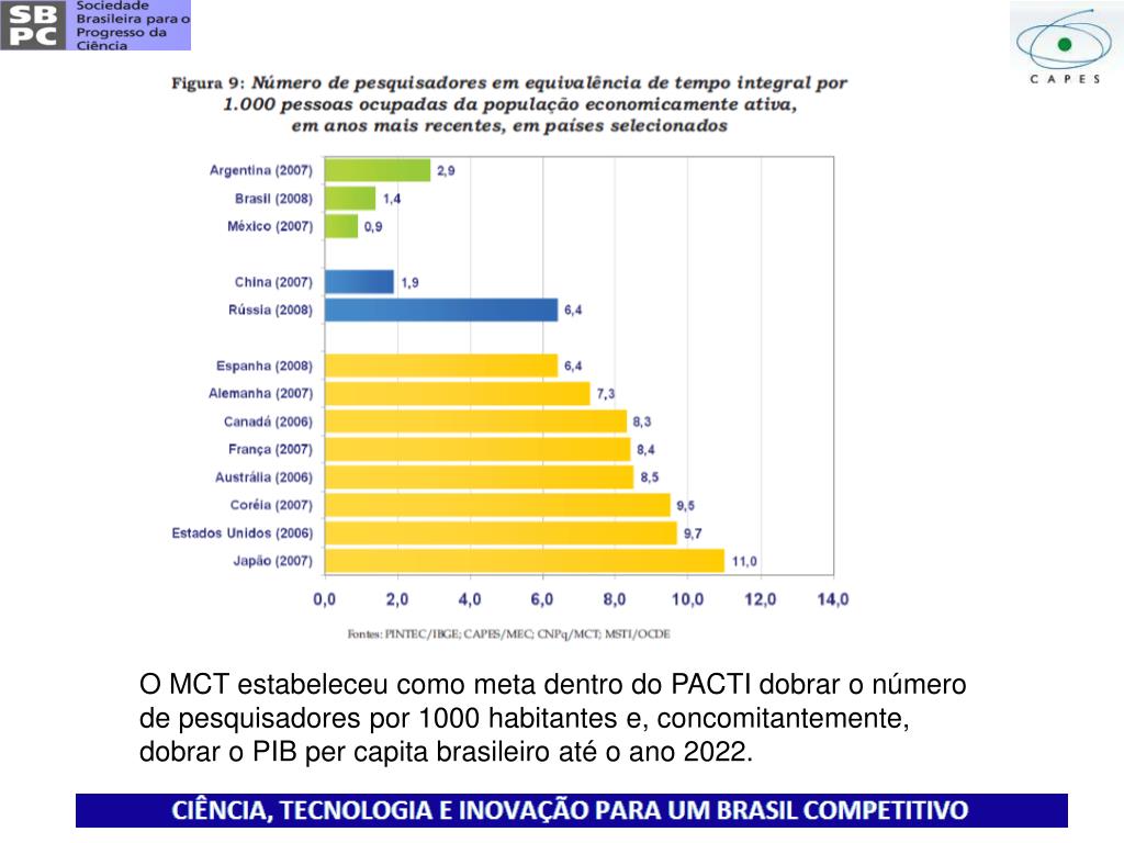 O MCT estabeleceu como meta dentro do PACTI dobrar o número de pesquisadores por 1000 habitantes e, concomitantemente, dobrar o PIB per capita brasileiro até o ano 2022.