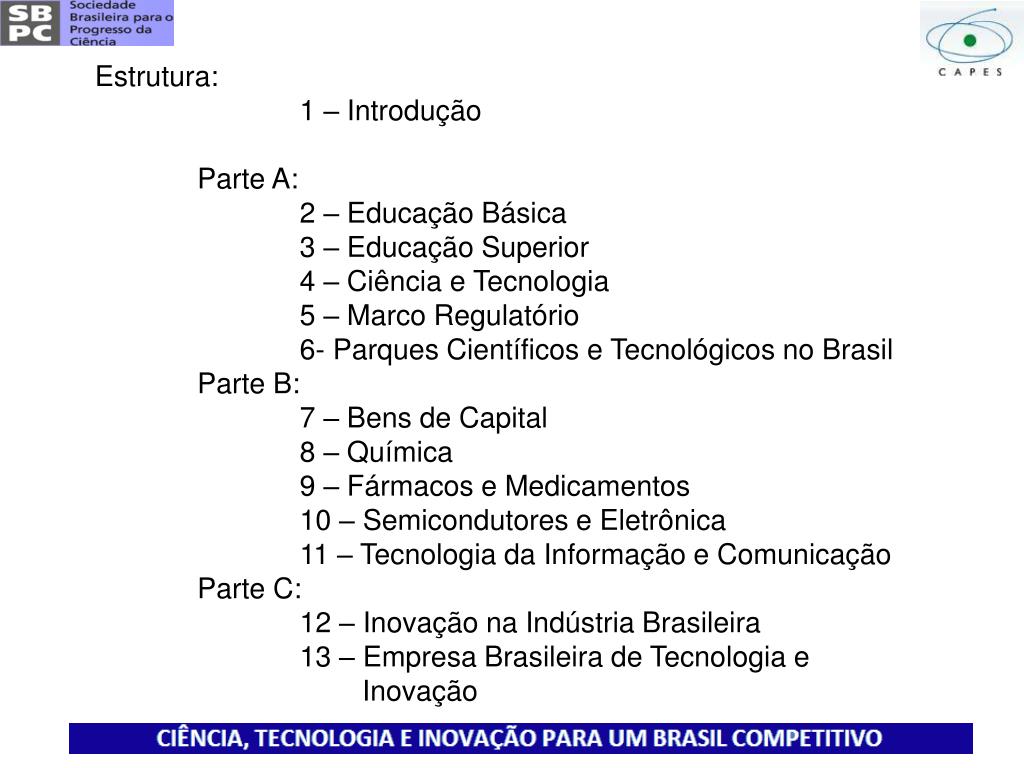 Estrutura: 1 – Introdução Parte A: 2 – Educação Básica 3 – Educação Superior 4 – Ciência e Tecnologia 5 – Marco Regulatório 6- Parques Científicos e Tecnológicos no Brasil Parte B: 7 – Bens de Capital 8 – Química 9 – Fármacos e Medicamentos 10 – Semicondutores e Eletrônica 11 – Tecnologia da Informação e Comunicação Parte C: 12 – Inovação na Indústria Brasileira 13 – Empresa Brasileira de Tecnologia e Inovação