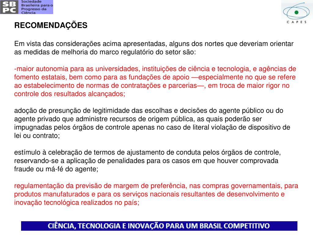 RECOMENDAÇÕES • Em vista das considerações acima apresentadas, alguns dos nortes que deveriam orientar as medidas de melhoria do marco regulatório do setor são: • maior autonomia para as universidades, instituições de ciência e tecnologia, e agências de fomento estatais, bem como para as fundações de apoio —especialmente no que se refere ao estabelecimento de normas de contratações e parcerias—, em troca de maior rigor no controle dos resultados alcançados; • adoção de presunção de legitimidade das escolhas e decisões do agente público ou do agente privado que administre recursos de origem pública, as quais poderão ser impugnadas pelos órgãos de controle apenas no caso de literal violação de dispositivo de lei ou contrato; • estímulo à celebração de termos de ajustamento de conduta pelos órgãos de controle, reservando-se a aplicação de penalidades para os casos em que houver comprovada fraude ou má-fé do agente; • regulamentação da previsão de margem de preferência, nas compras governamentais, para produtos manufaturados e para os serviços nacionais resultantes de desenvolvimento e inovação tecnológica realizados no país;