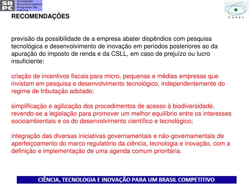 RECOMENDAÇÕES previsão da possibilidade de a empresa abater dispêndios com pesquisa tecnológica e desenvolvimento de inovação em períodos posteriores ao da apuração do imposto de renda e da CSLL, em caso de prejuízo ou lucro insuficiente; criação de incentivos fiscais para micro, pequenas e médias empresas que invistam em pesquisa e desenvolvimento tecnológico, independentemente do regime de tributação adotado; simplificação e agilização dos procedimentos de acesso à biodiversidade, revendo-se a legislação para promover um melhor equilíbrio entre os interesses socioambientais e os do desenvolvimento científico e tecnológico; integração das diversas iniciativas governamentais e não-governamentais de aperfeiçoamento do marco regulatório da ciência, tecnologia e inovação, com a definição e implementação de uma agenda comum prioritária.
