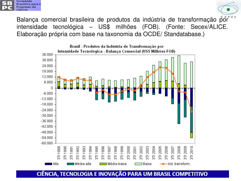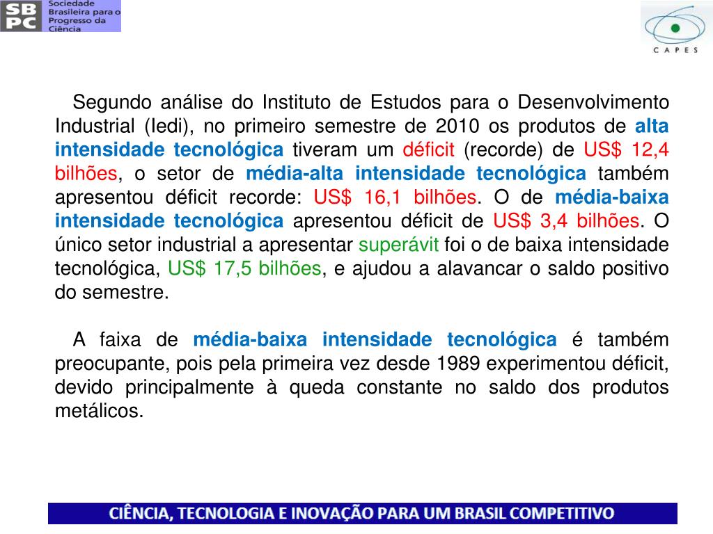 Segundo análise do Instituto de Estudos para o Desenvolvimento Industrial (Iedi), no primeiro semestre de 2010 os produtos de alta intensidade tecnológica tiveram um déficit (recorde) de US$ 12,4 bilhões, o setor de média-alta intensidade tecnológicatambém apresentou déficit recorde: US$ 16,1 bilhões. O de média-baixa intensidade tecnológica apresentou déficit de US$ 3,4 bilhões. O único setor industrial a apresentar superávit foi o de baixa intensidade tecnológica, US$ 17,5 bilhões, e ajudou a alavancar o saldo positivo do semestre. A faixa de média-baixa intensidade tecnológica é também preocupante, pois pela primeira vez desde 1989 experimentou déficit, devido principalmente à queda constante no saldo dos produtos metálicos.