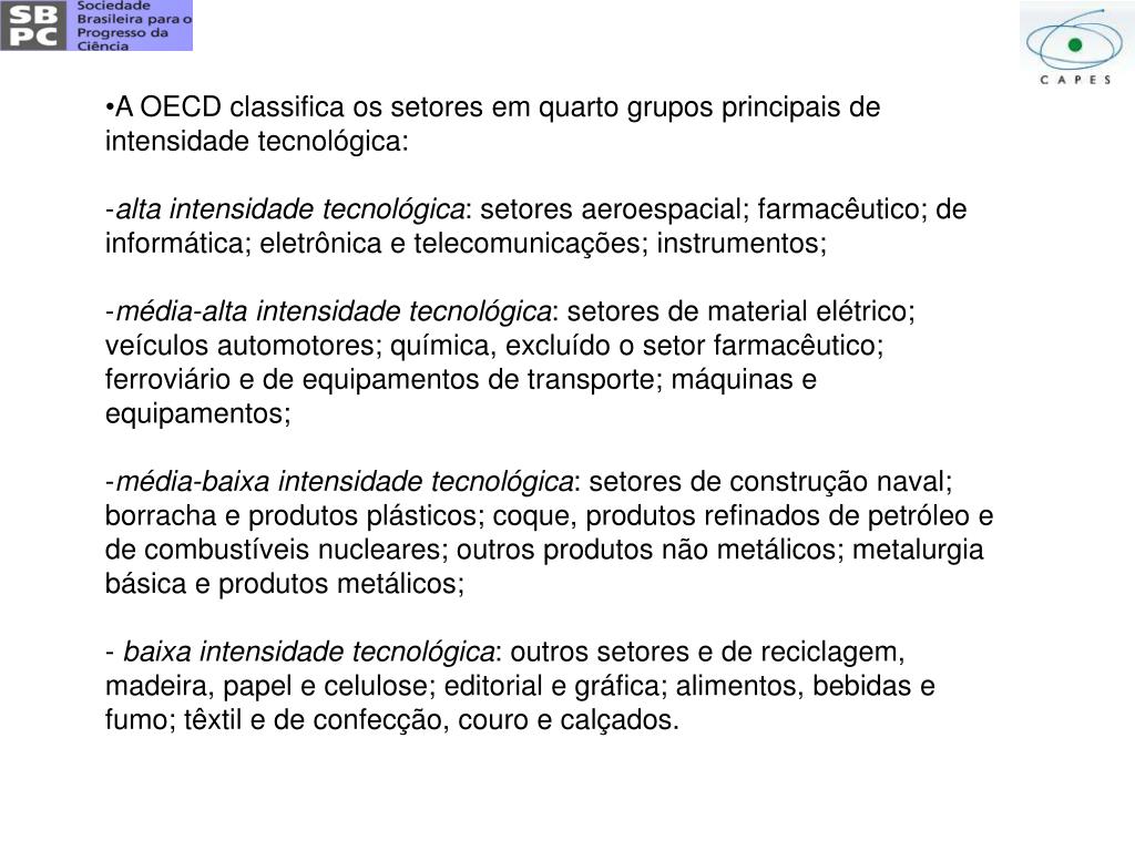 A OECD classifica os setores em quarto grupos principais de intensidade tecnológica: • alta intensidade tecnológica: setores aeroespacial; farmacêutico; de informática; eletrônica e telecomunicações; instrumentos; • média-alta intensidade tecnológica: setores de material elétrico; veículos automotores; química, excluído o setor farmacêutico; ferroviário e de equipamentos de transporte; máquinas e equipamentos; • média-baixa intensidade tecnológica: setores de construção naval; borracha e produtos plásticos; coque, produtos refinados de petróleo e de combustíveis nucleares; outros produtos não metálicos; metalurgia básica e produtos metálicos; • - baixa intensidade tecnológica: outros setores e de reciclagem, madeira, papel e celulose; editorial e gráfica; alimentos, bebidas e fumo; têxtil e de confecção, couro e calçados.