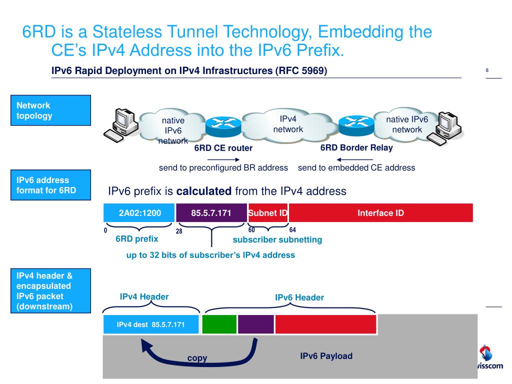 No complex upgrade of infrastructure, leverage IPv4 network to provide IPv6 access. Simply... Add IPv6 and 6RD support to customer modems Add 6RD Border Relays to dual-stack portion of network Using 6RD, IPv6 Internet access is an incremental upgrade.Production-quality IPv6 Internet access at a fraction of the costs 6RD Border Relay Lausanne 6RD CErouter native IPv6 home network IPv6 Internet IPv4 access network Home network (dual stack) Swisscom Internet Access Service network (IPv4 only) 6RD Border Relay Zürich Internet peering (dual stack)
