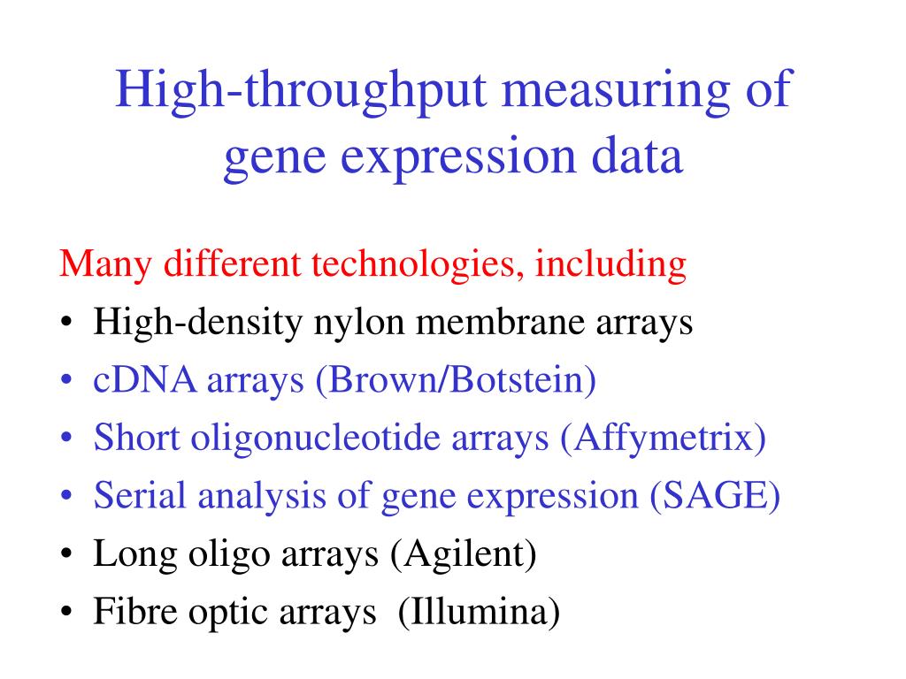 High-throughput measuring of gene expression data • Many different technologies, including • High-density nylon membrane arrays • cDNA arrays (Brown/Botstein) • Short oligonucleotide arrays (Affymetrix) • Serial analysis of gene expression (SAGE) • Long oligo arrays (Agilent) • Fibre optic arrays (Illumina)