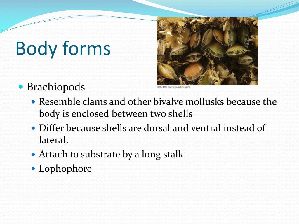Body forms • Brachiopods • Resemble clams and other bivalve mollusks because the body is enclosed between two shells • Differ because shells are dorsal and ventral instead of lateral. • Attach to substrate by a long stalk • Lophophore