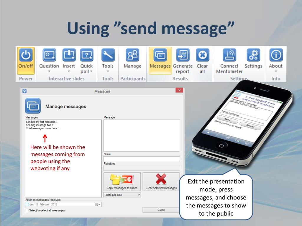 Using ”send message” Here will be shown the messages coming from people using the webvoting if any Exit the presentation mode, press messages, and choose the messages to show to the public