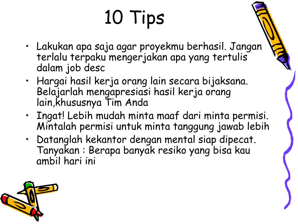 10 Tips • Lakukan apa saja agar proyekmu berhasil. Jangan terlalu terpaku mengerjakan apa yang tertulis dalam job desc • Hargai hasil kerja orang lain secara bijaksana. Belajarlah mengapresiasi hasil kerja orang lain,khususnya Tim Anda • Ingat! Lebih mudah minta maaf dari minta permisi. Mintalah permisi untuk minta tanggung jawab lebih • Datanglah kekantor dengan mental siap dipecat. Tanyakan : Berapa banyak resiko yang bisa kau ambil hari ini