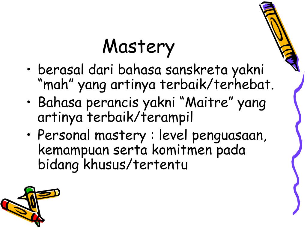 Mastery • berasal dari bahasa sanskreta yakni “mah” yang artinya terbaik/terhebat. • Bahasa perancis yakni “Maitre” yang artinya terbaik/terampil • Personal mastery : level penguasaan, kemampuan serta komitmen pada bidang khusus/tertentu