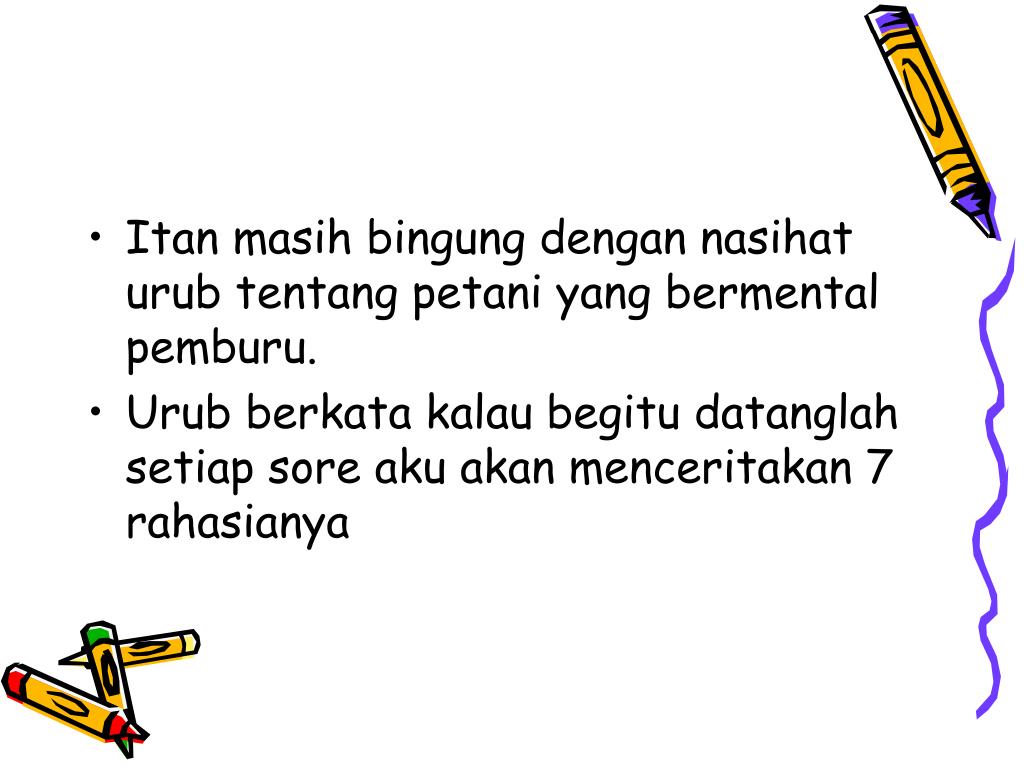 Itan masih bingung dengan nasihat urub tentang petani yang bermental pemburu. • Urub berkata kalau begitu datanglah setiap sore aku akan menceritakan 7 rahasianya