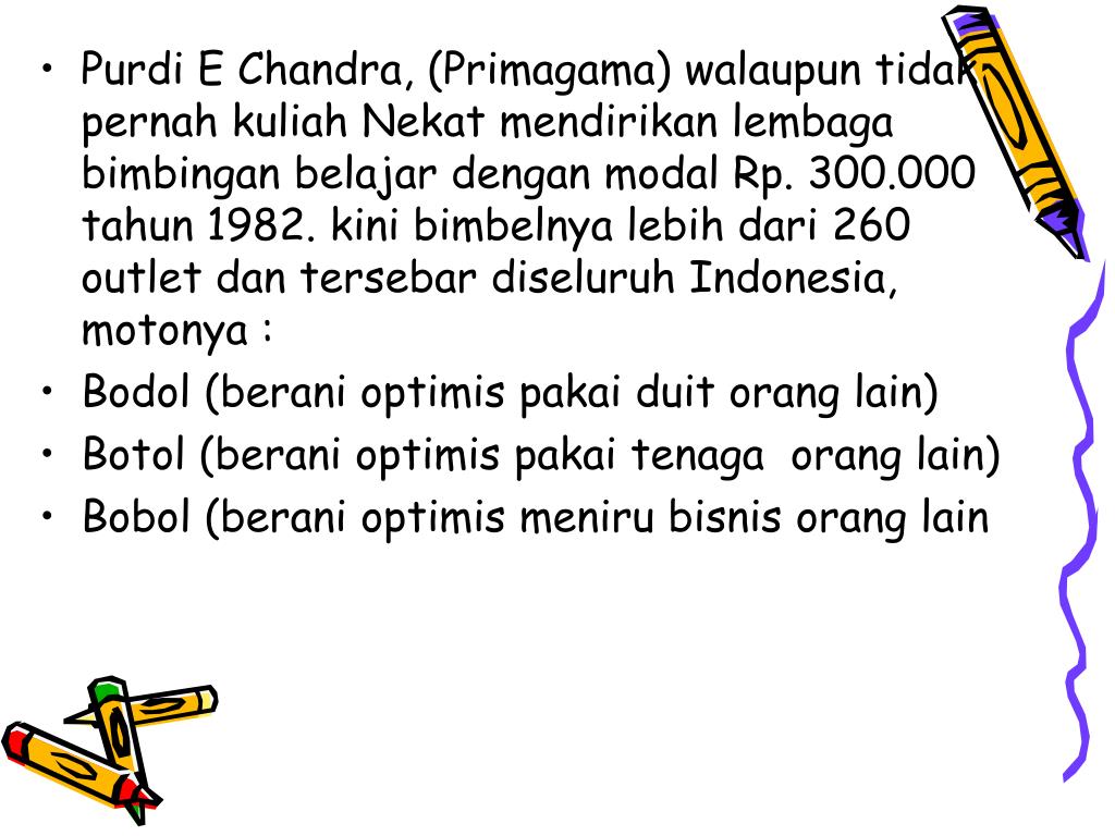 Purdi E Chandra, (Primagama) walaupun tidak pernah kuliah Nekat mendirikan lembaga bimbingan belajar dengan modal Rp. 300.000 tahun 1982. kini bimbelnya lebih dari 260 outlet dan tersebar diseluruh Indonesia, motonya : • Bodol (berani optimis pakai duit orang lain) • Botol (berani optimis pakai tenaga orang lain) • Bobol (berani optimis meniru bisnis orang lain