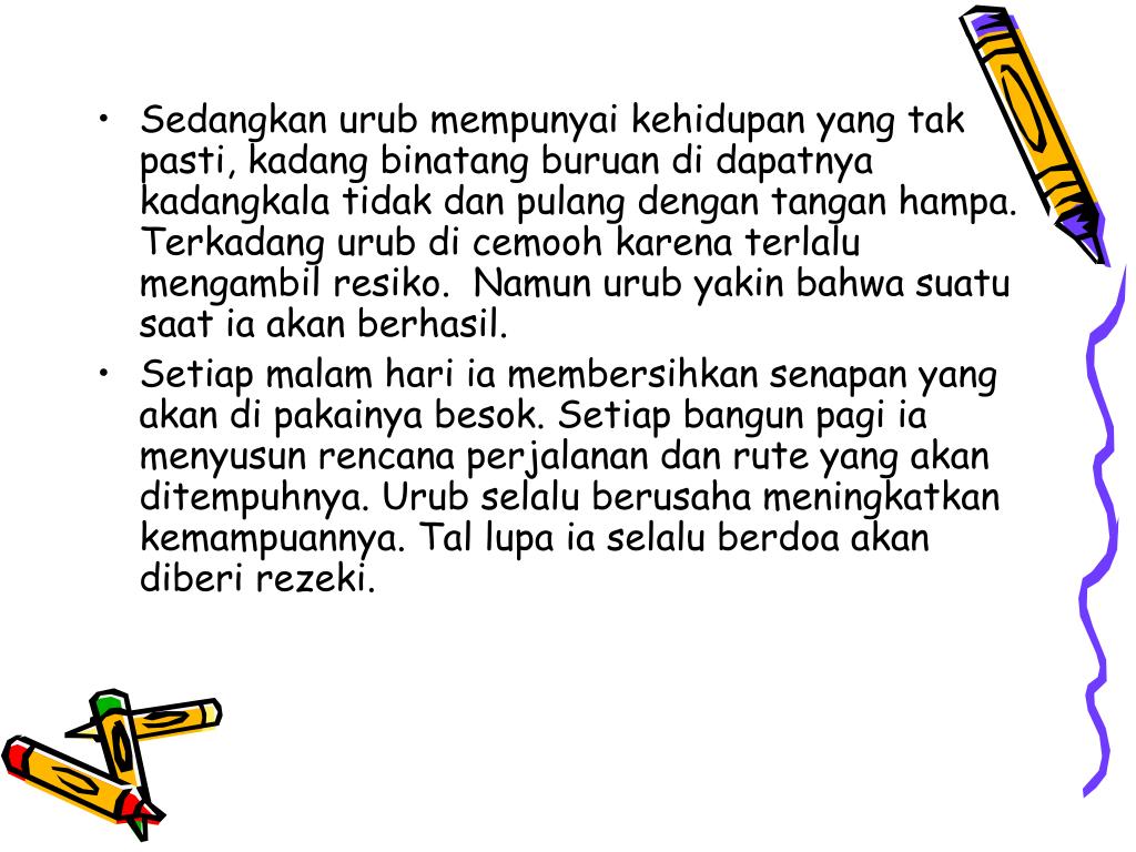 stori • Ada dua orang sahabat yakni urub dan itan. Urub memilih menjadi pemburu dan itan memilih menjadi petani .penggarap. • Kehidupan itan berlangsung dengan baik dan tenang. Setiap pagi pergi keladang, penghasilan cukup. Jika aturan dan prosedur kerja diikutinya, ia yakin jabatan dan penghasilan akan bertambah baik. Dalam keluarganya Itan sangat disegani karena punya status dan pekerjaan yang tetap