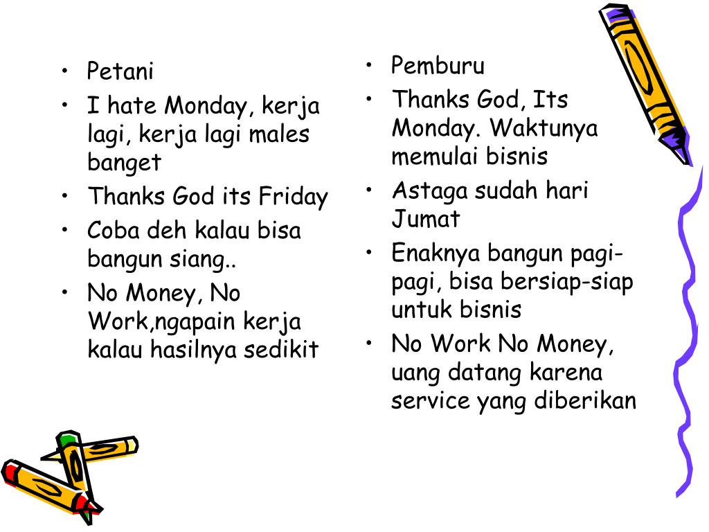 Petani I hate Monday, kerja lagi, kerja lagi males banget Thanks God its Friday Coba deh kalau bisa bangun siang.. No Money, No Work,ngapain kerja kalau hasilnya sedikit Pemburu Thanks God, Its Monday. Waktunya memulai bisnis Astaga sudah hari Jumat Enaknya bangun pagi-pagi, bisa bersiap-siap untuk bisnis No Work No Money, uang datang karena service yang diberikan