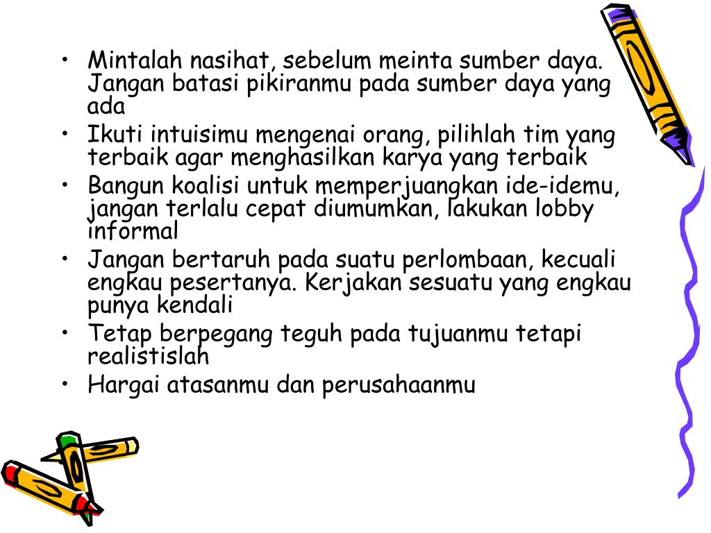 Ciri-ciri • Berani mengambil resiko • Mengalami kegagalan tetapi bangkit lagi • Terus-menerus belajar • Dimulai skala kecil dan terus berkembang • Disiplin berjuang sampai berhasil • Ambisi positif untuk maju
