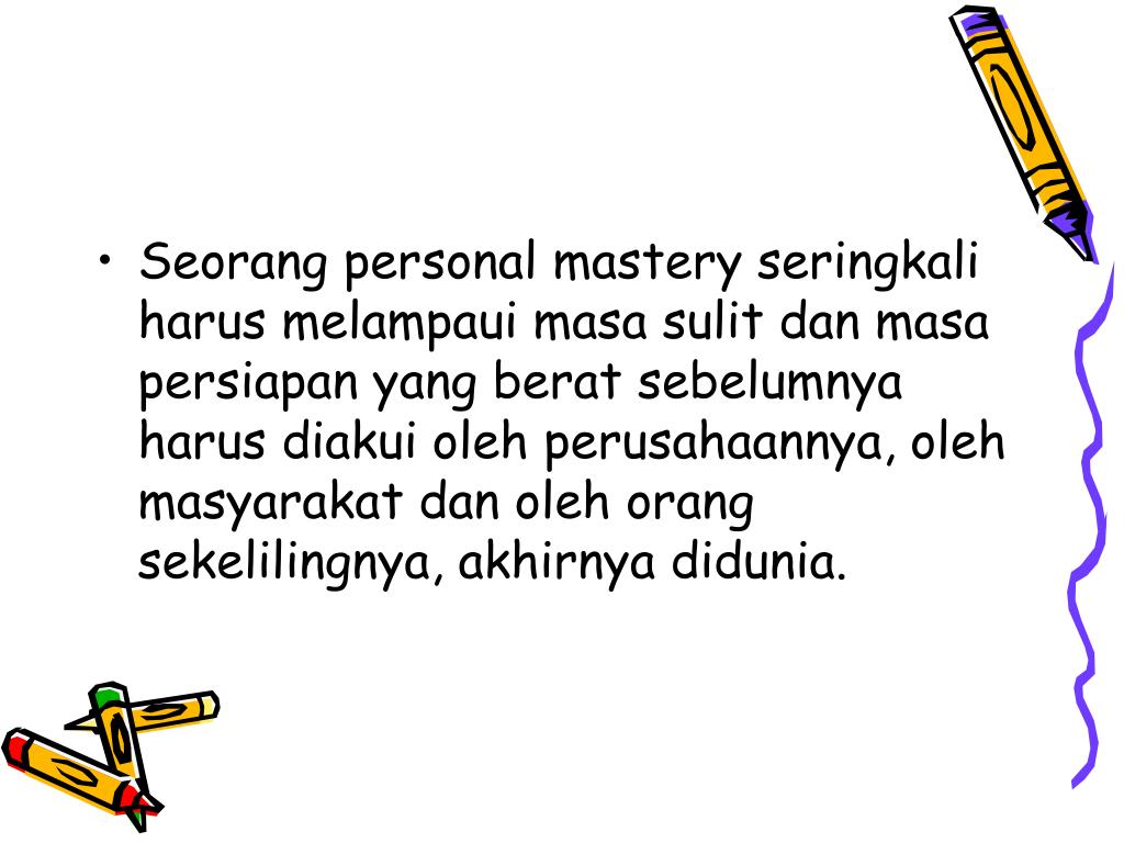Seorang personal mastery seringkali harus melampaui masa sulit dan masa persiapan yang berat sebelumnya harus diakui oleh perusahaannya, oleh masyarakat dan oleh orang sekelilingnya, akhirnya didunia.