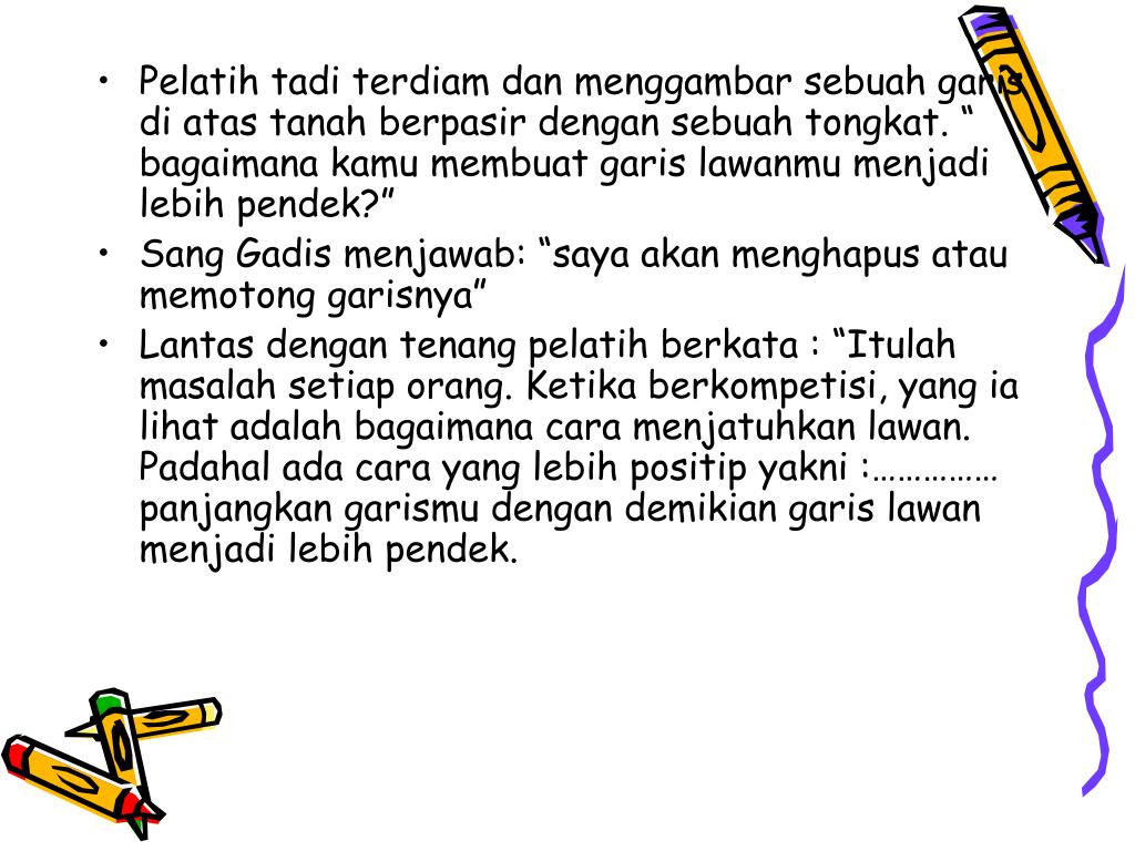 Pelatih tadi terdiam dan menggambar sebuah garis di atas tanah berpasir dengan sebuah tongkat. “ bagaimana kamu membuat garis lawanmu menjadi lebih pendek?” • Sang Gadis menjawab: “saya akan menghapus atau memotong garisnya” • Lantas dengan tenang pelatih berkata : “Itulah masalah setiap orang. Ketika berkompetisi, yang ia lihat adalah bagaimana cara menjatuhkan lawan. Padahal ada cara yang lebih positip yakni :…………… panjangkan garismu dengan demikian garis lawan menjadi lebih pendek.