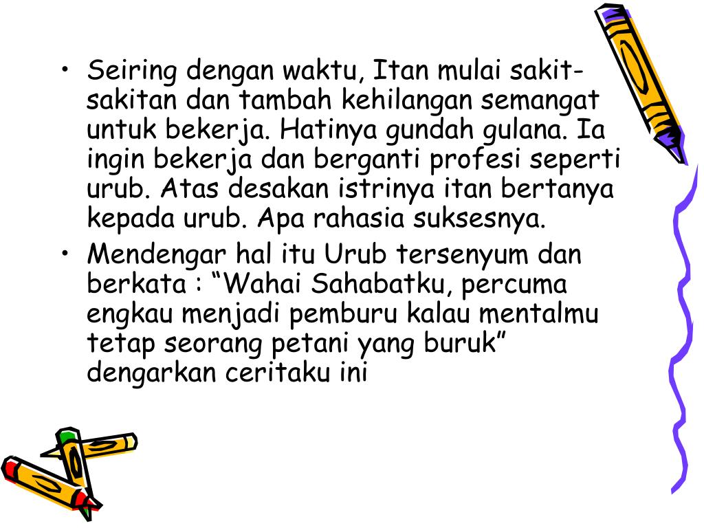 Seiring dengan waktu, Itan mulai sakit-sakitan dan tambah kehilangan semangat untuk bekerja. Hatinya gundah gulana. Ia ingin bekerja dan berganti profesi seperti urub. Atas desakan istrinya itan bertanya kepada urub. Apa rahasia suksesnya. • Mendengar hal itu Urub tersenyum dan berkata : “Wahai Sahabatku, percuma engkau menjadi pemburu kalau mentalmu tetap seorang petani yang buruk” dengarkan ceritaku ini