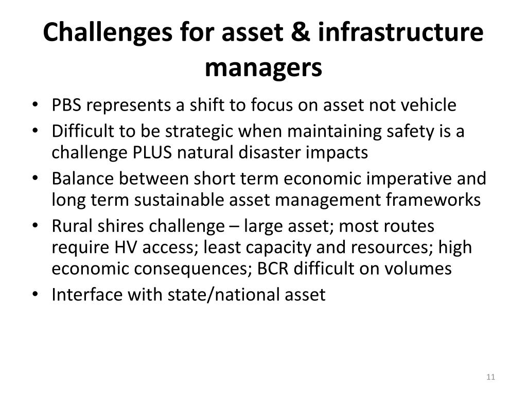 Challenges for asset & infrastructure managers • PBS represents a shift to focus on asset not vehicle • Difficult to be strategic when maintaining safety is a challenge PLUS natural disaster impacts • Balance between short term economic imperative and long term sustainable asset management frameworks • Rural shires challenge – large asset; most routes require HV access; least capacity and resources; high economic consequences; BCR difficult on volumes • Interface with state/national asset