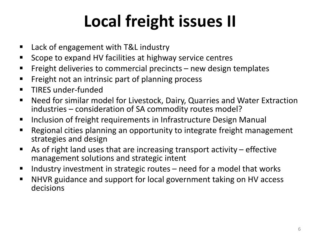 Local freight issues II • Lack of engagement with T&L industry • Scope to expand HV facilities at highway service centres • Freight deliveries to commercial precincts – new design templates • Freight not an intrinsic part of planning process • TIRES under-funded • Need for similar model for Livestock, Dairy, Quarries and Water Extraction industries – consideration of SA commodity routes model? • Inclusion of freight requirements in Infrastructure Design Manual • Regional cities planning an opportunity to integrate freight management strategies and design • As of right land uses that are increasing transport activity – effective management solutions and strategic intent • Industry investment in strategic routes – need for a model that works • NHVR guidance and support for local government taking on HV access decisions