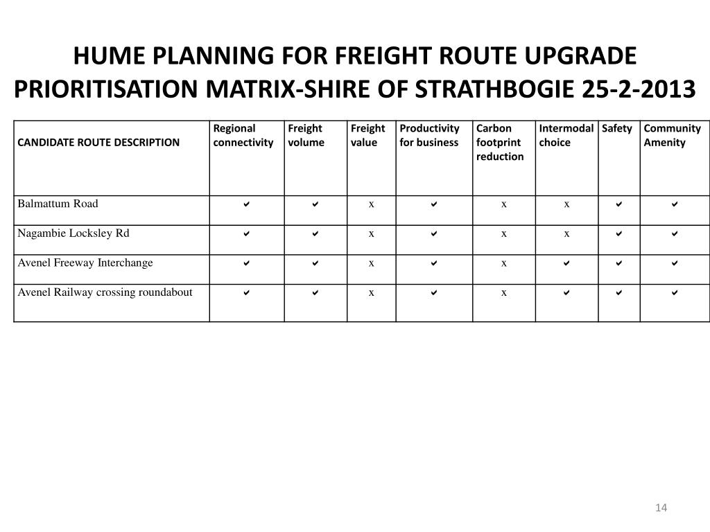 HUME PLANNING FOR FREIGHT ROUTE UPGRADE PRIORITISATION MATRIX-SHIRE OF STRATHBOGIE 25-2-2013