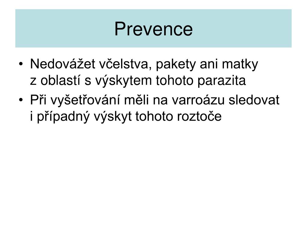 Prevence • Nedovážet včelstva, pakety ani matky z oblastí s výskytem tohoto parazita • Při vyšetřování měli na varroázu sledovat i případný výskyt tohoto roztoče