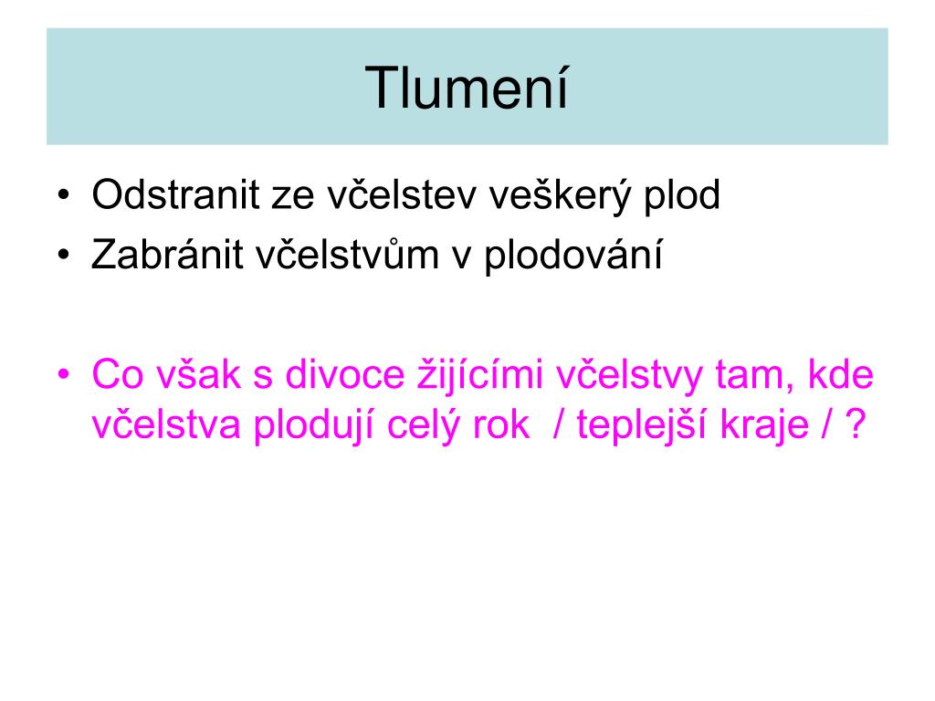 Tlumení • Odstranit ze včelstev veškerý plod • Zabránit včelstvům v plodování • Co však s divoce žijícími včelstvy tam, kde včelstva plodují celý rok / teplejší kraje / ?
