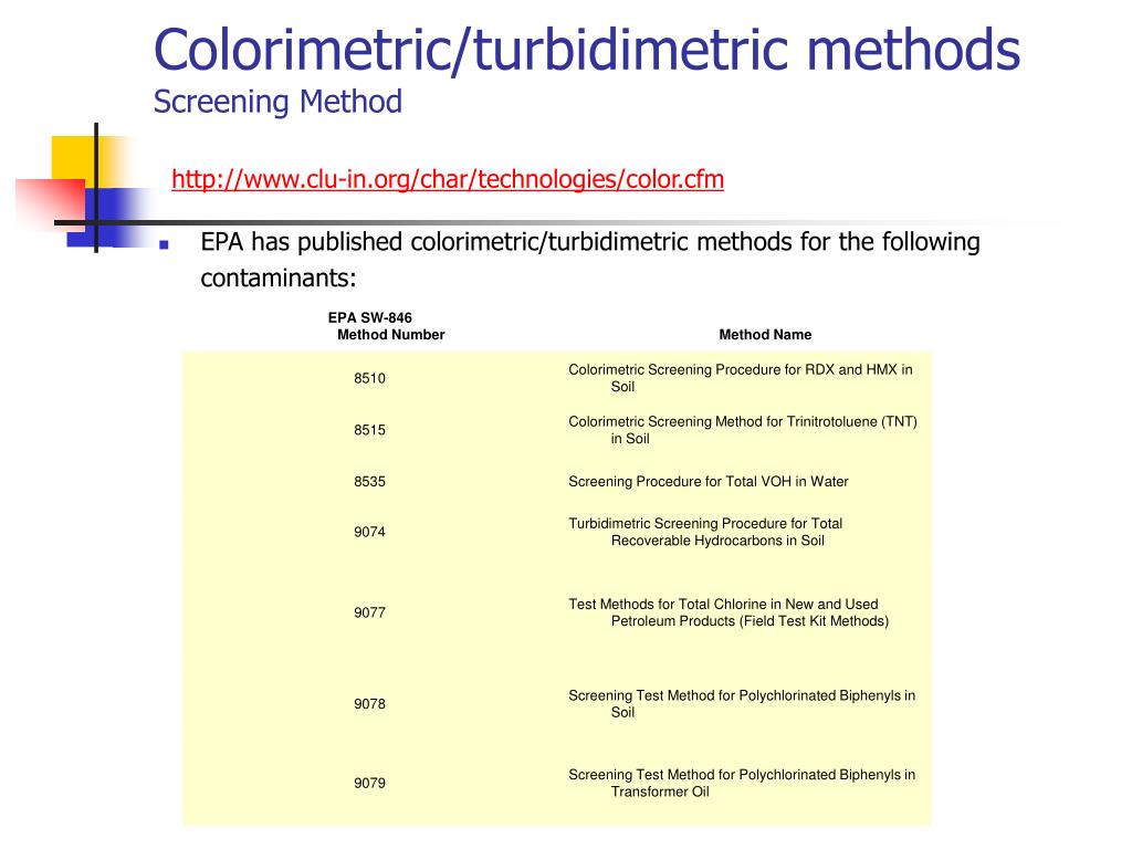 Colorimetric/turbidimetric methods Screening Methodhttp://www.clu-in.org/char/technologies/color.cfm • EPA has published colorimetric/turbidimetric methods for the following contaminants: