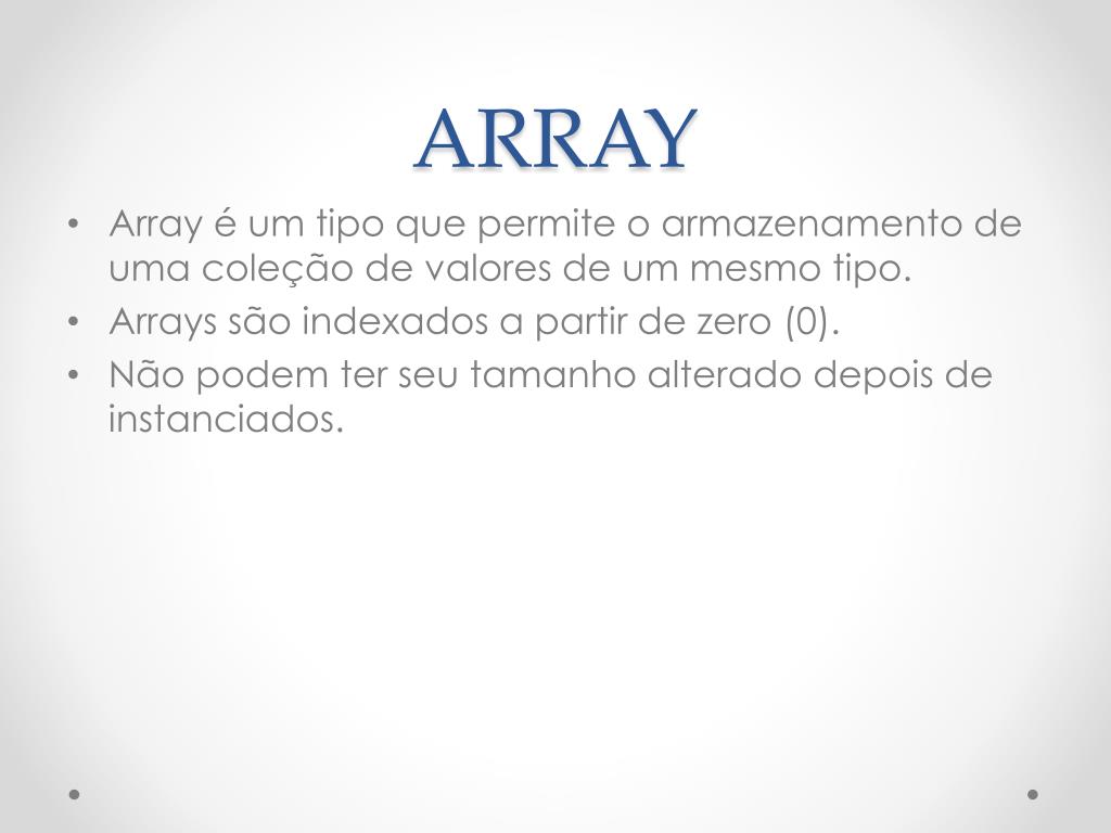 ARRAY • Array é um tipo que permite o armazenamento de uma coleção de valores de um mesmo tipo. • Arrays são indexados a partir de zero (0). • Não podem ter seu tamanho alterado depois de instanciados.