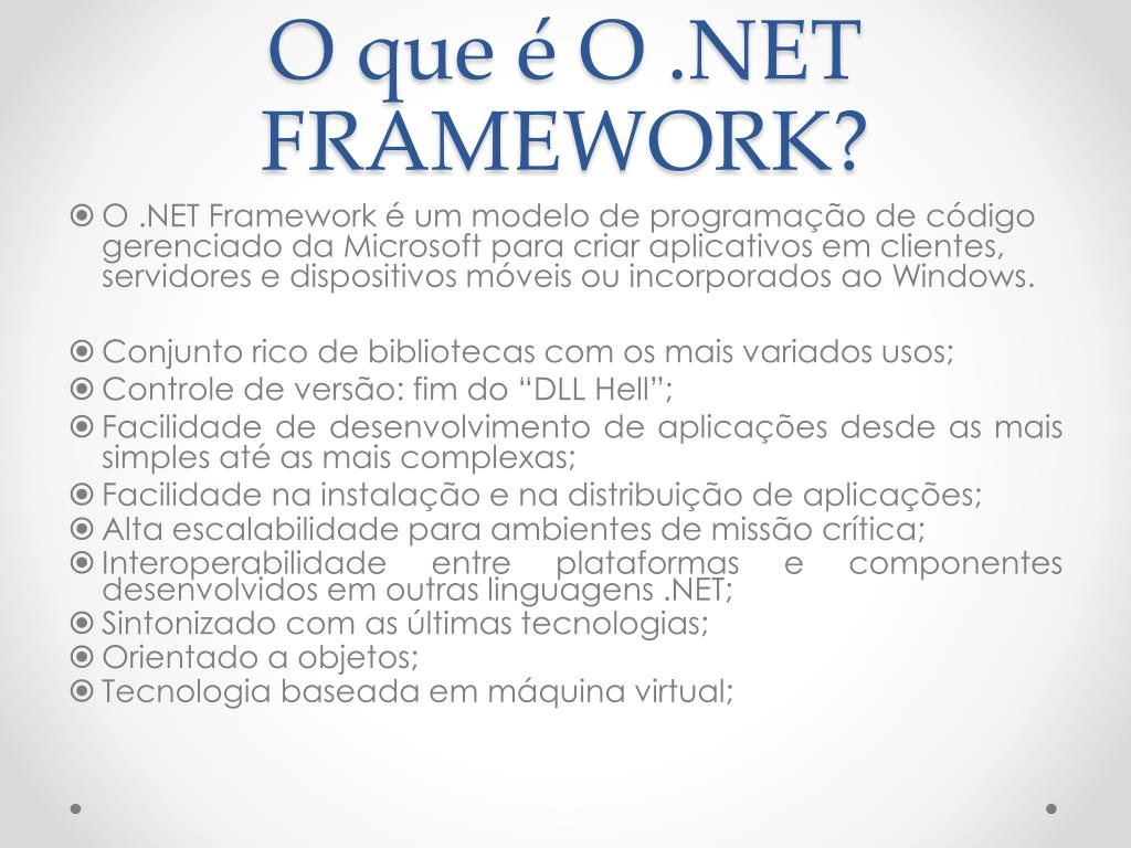 O que é O .NET FRAMEWORK? • O .NET Framework é um modelo de programação de código gerenciado da Microsoft para criar aplicativos em clientes, servidores e dispositivos móveis ou incorporados ao Windows. • Conjunto rico de bibliotecas com os mais variados usos; • Controle de versão: fim do “DLL Hell”; • Facilidade de desenvolvimento de aplicações desde as mais simples até as mais complexas; • Facilidade na instalação e na distribuição de aplicações; • Alta escalabilidade para ambientes de missão crítica; • Interoperabilidade entre plataformas e componentes desenvolvidos em outras linguagens .NET; • Sintonizado com as últimas tecnologias; • Orientado a objetos; • Tecnologia baseada em máquina virtual;