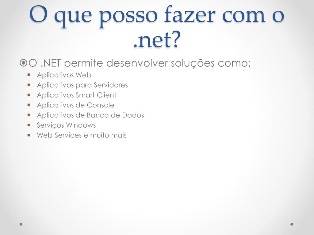 O que posso fazer com o .net? • O .NET permite desenvolver soluções como: • Aplicativos Web • Aplicativos para Servidores • Aplicativos SmartClient • Aplicativos de Console • Aplicativos de Banco de Dados • Serviços Windows • Web Services e muito mais
