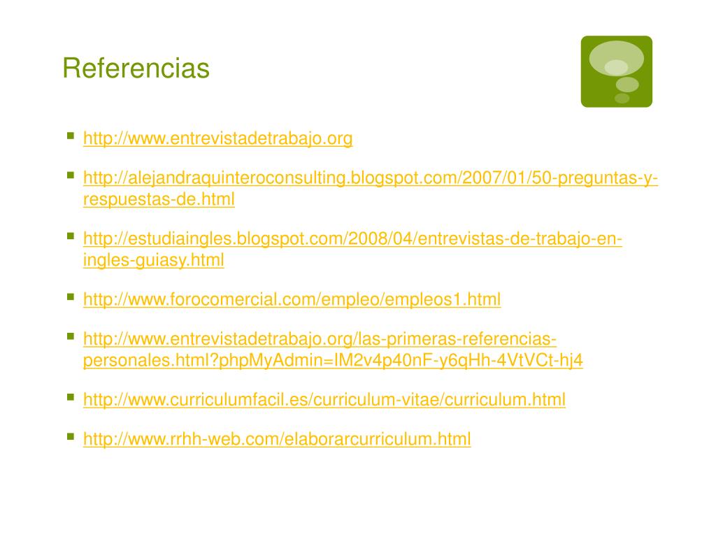 Referencias http://www.entrevistadetrabajo.org http://alejandraquinteroconsulting.blogspot.com/2007/01/50-preguntas-y-respuestas-de.html http://estudiaingles.blogspot.com/2008/04/entrevistas-de-trabajo-en-ingles-guiasy.html http://www.forocomercial.com/empleo/empleos1.html http://www.entrevistadetrabajo.org/las-primeras-referencias-personales.html?phpMyAdmin=IM2v4p40nF-y6qHh-4VtVCt-hj4 http://www.curriculumfacil.es/curriculum-vitae/curriculum.html http://www.rrhh-web.com/elaborarcurriculum.html
