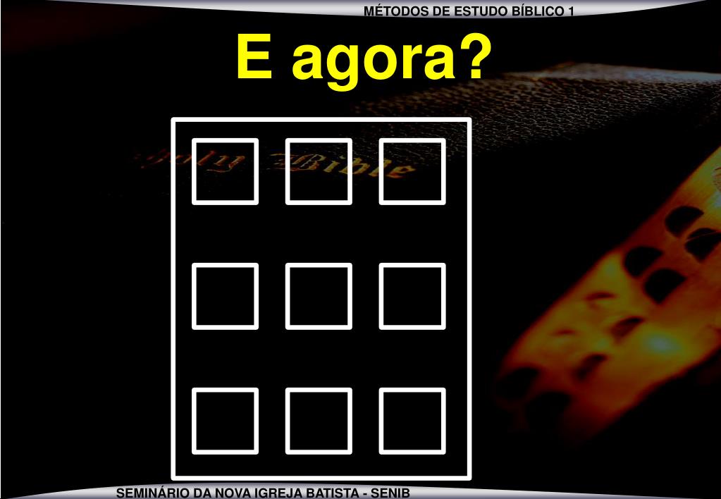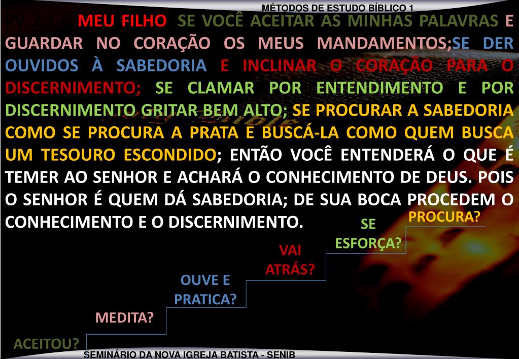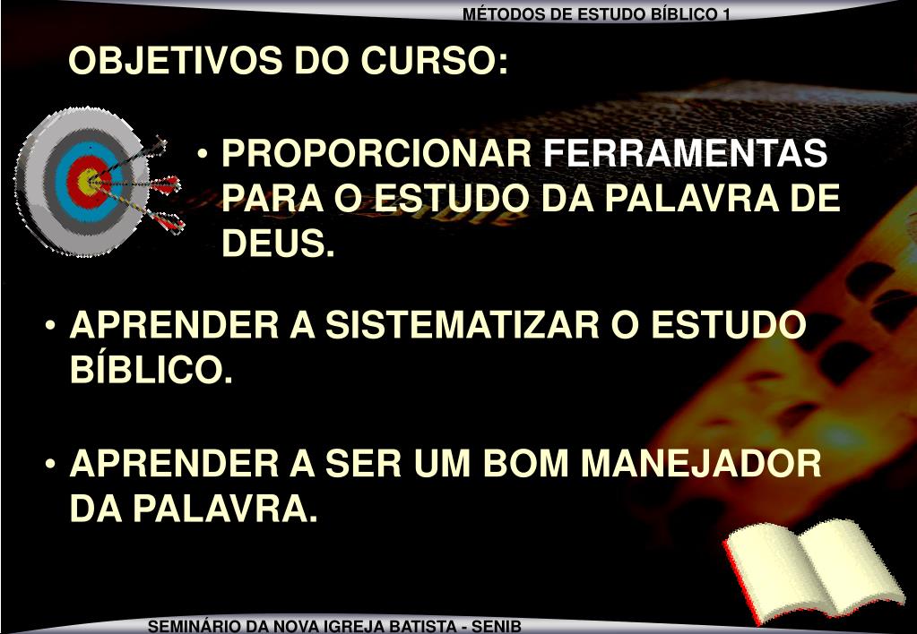 MÉTODOS DE ESTUDO BÍBLICO. A Bíblia é o manual da vida. Precisamos estudar o manual para vivermos melhor. Métodos 1 : Sua Meditação Seu Desafio. OBJETIVOS DO CURSO:. PROPORCIONAR FERRAMENTAS PARA O ESTUDO DA PALAVRA DE DEUS. APRENDER A SISTEMATIZAR O ESTUDO BÍBLICO.