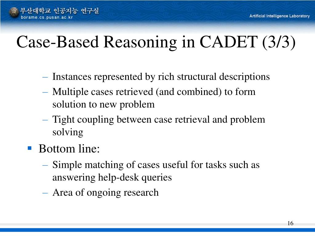 Case-Based Reasoning in CADET (3/3) • Instances represented by rich structural descriptions • Multiple cases retrieved (and combined) to form solution to new problem • Tight coupling between case retrieval and problem solving • Bottom line: • Simple matching of cases useful for tasks such as answering help-desk queries • Area of ongoing research