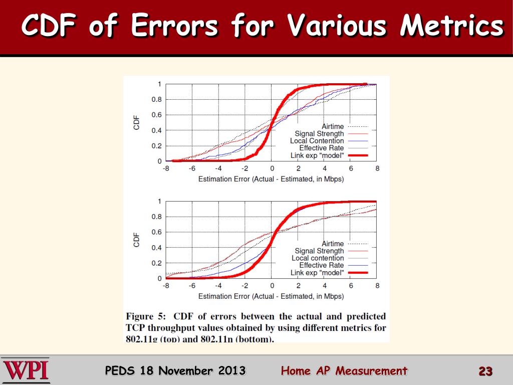 Benchmarks to Evaluate Witt Ground truth TCP throughput measurements are compared against predicted TCP throughputs using linear regression of effective rate and link experience (see Figure 4). CDF of errors between actual vs predicted TCP throughputs using different metrics (see Figure 5). PEDS 18 November 2013 Home AP Measurement