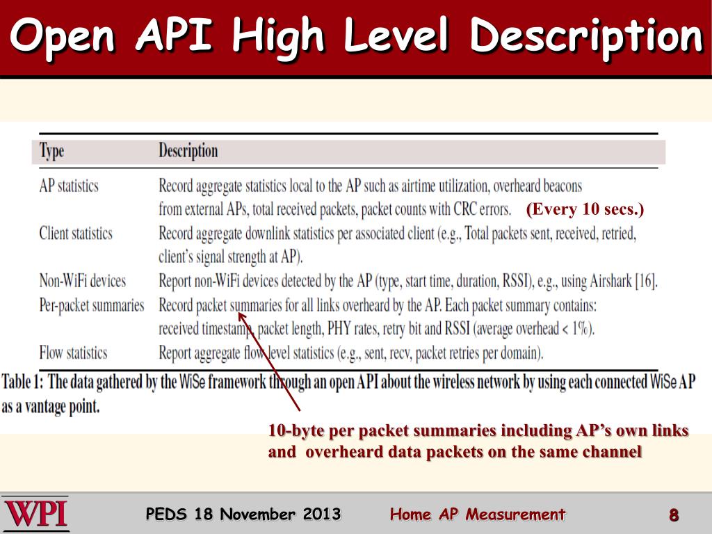 Open API High Level Description (Every 10 secs.) 10-byte per packet summaries including AP’s own links and overheard data packets on the same channel PEDS 18 November 2013 Home AP Measurement