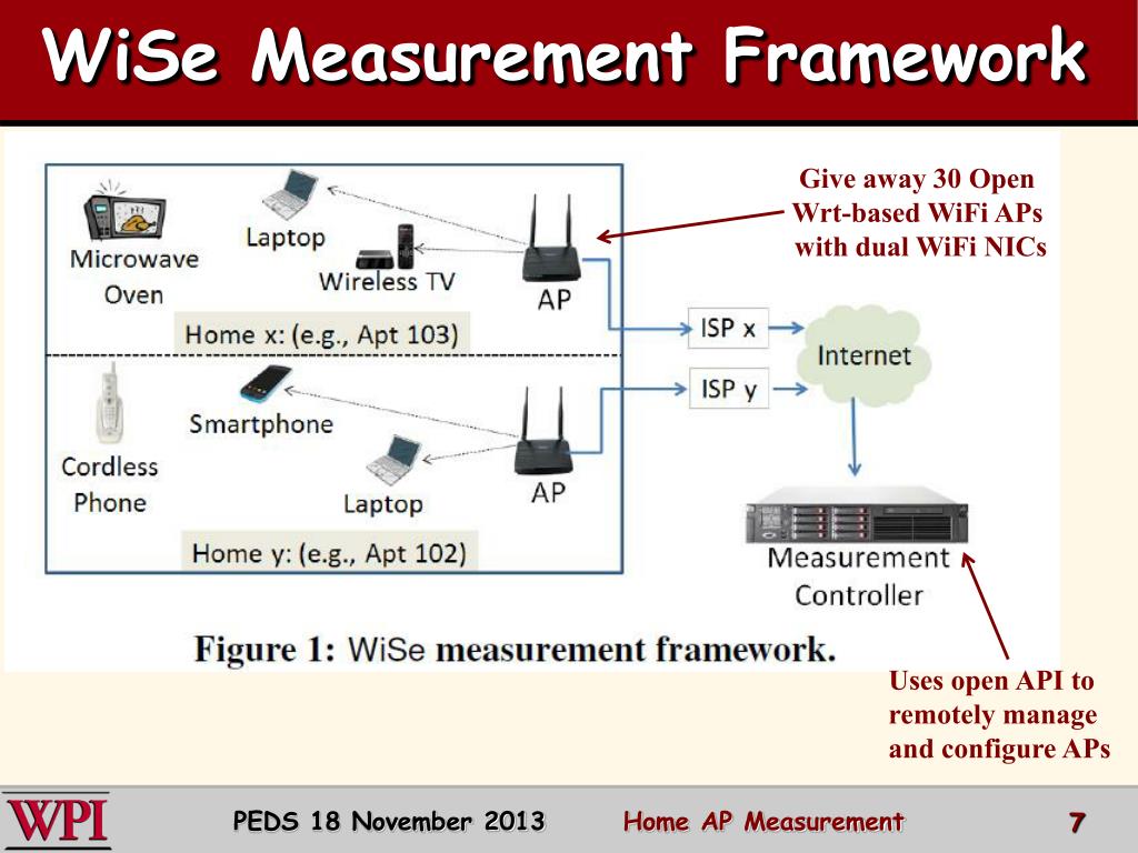 WiSe Measurement Framework Give away 30 Open Wrt-based WiFiAPs with dual WiFi NICs Uses open API to remotely manage and configure APs PEDS 18 November 2013 Home AP Measurement
