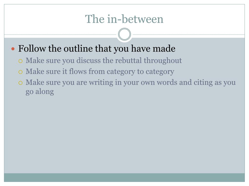 The in-between • Follow the outline that you have made • Make sure you discuss the rebuttal throughout • Make sure it flows from category to category • Make sure you are writing in your own words and citing as you go along