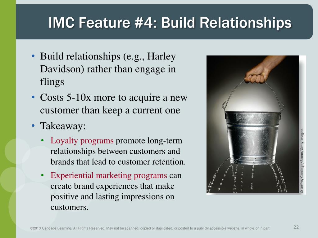 IMC Feature #4: Build Relationships • Build relationships (e.g., Harley Davidson) rather than engage in flings • Costs 5-10x more to acquire a new customer than keep a current one • Takeaway: • Loyalty programs promote long-term relationships between customers and brands that lead to customer retention. • Experiential marketing programs can create brand experiences that make positive and lasting impressions on customers.