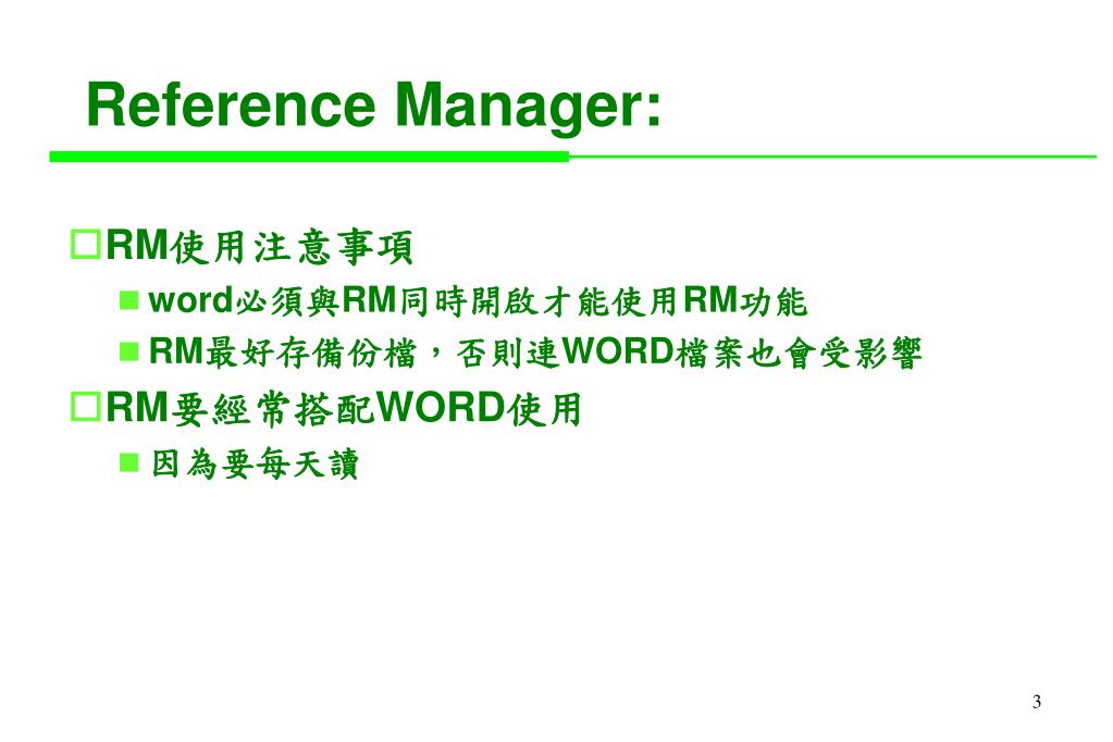 Reference Manager: • RM使用注意事項 • word必須與RM同時開啟才能使用RM功能 • RM最好存備份檔,否則連WORD檔案也會受影響 • RM要經常搭配WORD使用 • 因為要每天讀