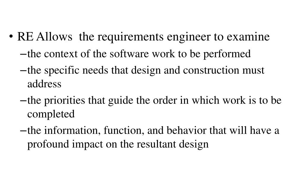 RE Allows the requirements engineer to examine • the context of the software work to be performed • the specific needs that design and construction must address • the priorities that guide the order in which work is to be completed • the information, function, and behavior that will have a profound impact on the resultant design