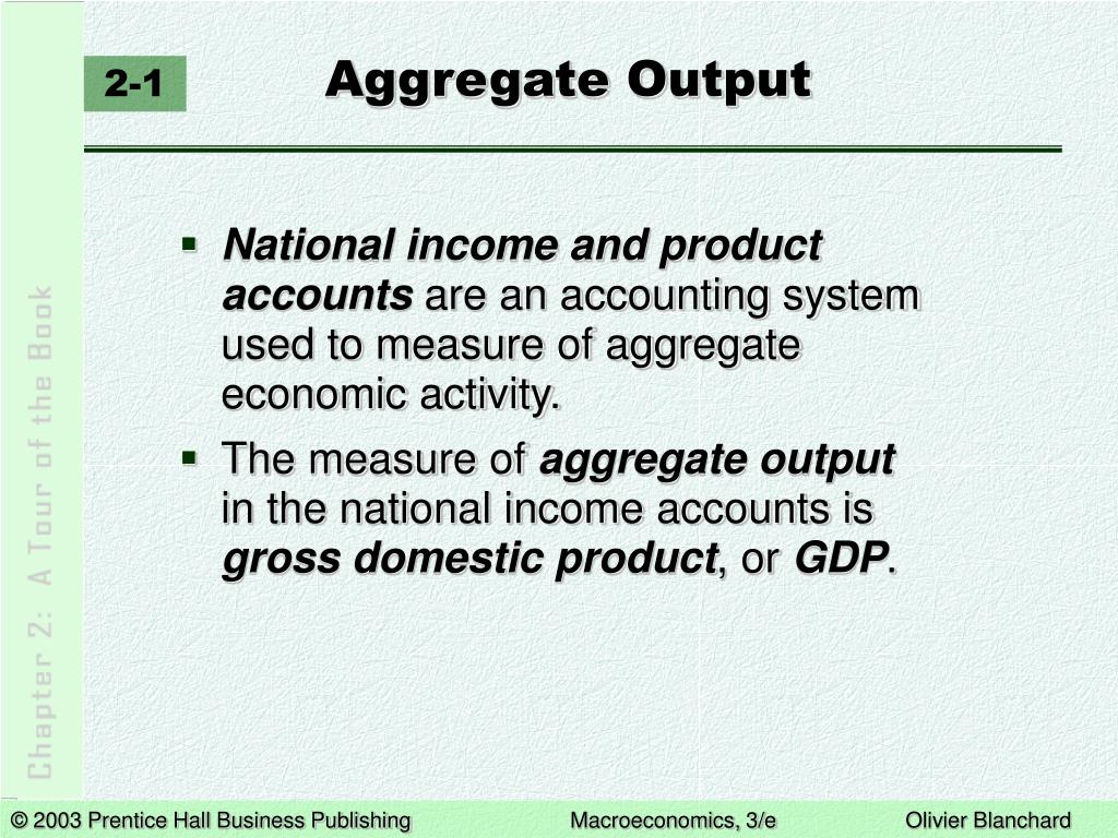 Aggregate Output 2-1 • National income and product accounts are an accounting system used to measure of aggregate economic activity. • The measure of aggregate output in the national income accounts is gross domestic product, or GDP.
